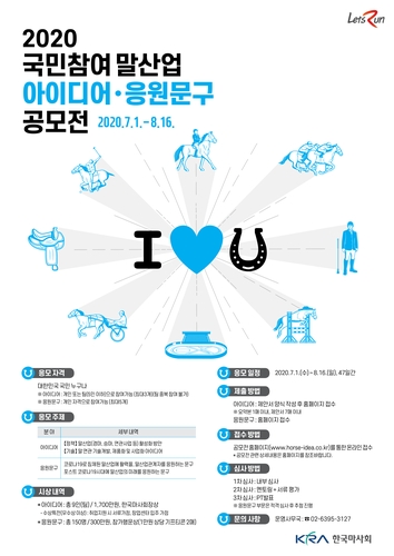 한국마사회, 말산업 아이디어·응원 문구 공모전 시행 (서울=연합뉴스) 김동찬 기자 = 한국마사회가 신종 코로나바이러스 감염증(코로나19) 때문에 침체한 말산업 발전을 위해 응원 문구와 아이디어를 공개 모집한다. 공모 분야는 응원 문구와 말산업 아이디어로 나뉜다. 응원 문구…