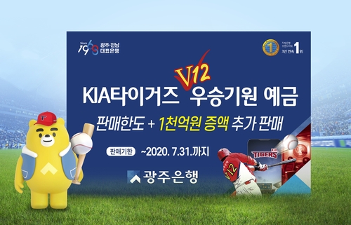 광주은행, KIA타이거즈 우승기원 예금 인기…추가 판매 (광주=연합뉴스) 송형일 기자 = 광주은행은 KIA타이거즈 우승기원 예금의 판매 한도를 기존 2천억원에서 3천억원으로 증액해 판매를 이어간다고 30일 밝혔다. KIA타이거즈 우승기원 예금은 출시 2개월 만에 1만계좌를 돌파하고 판매 …