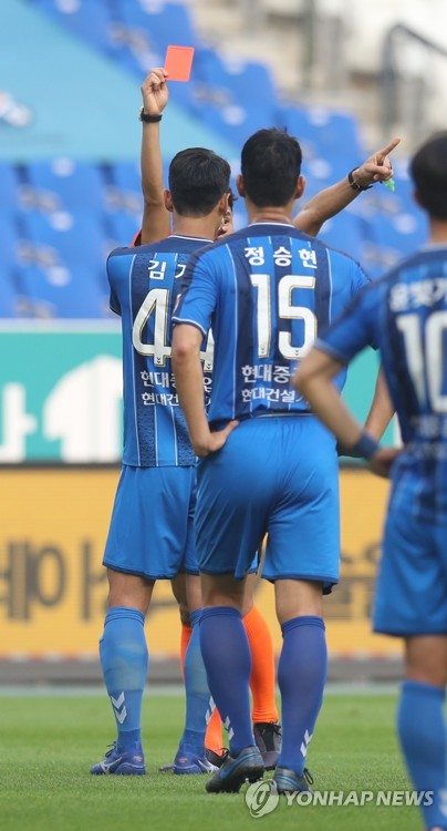 공은 건드리지도 않고 김보경의 왼 발목을 찍듯이 밟는, 명백한 '퇴장감' 파울이었다. 주심은 전반 26분 비디오판독(VAR) 뒤 김기희를 향해 곧바로 레드카드를 꺼내 들었다.