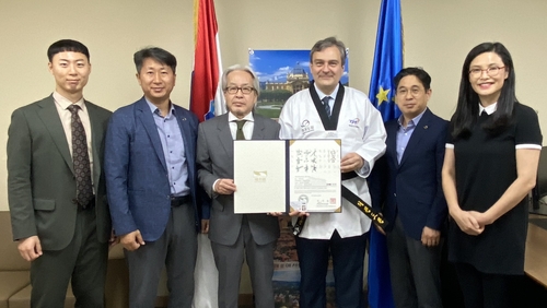 주한크로아티아 대사, 태권도 명예 6단 되다 (서울=연합뉴스) 배진남 기자 = 다미르 쿠센 주한크로아티아 대사가 태권도 명예 6단이 됐다. 태권도진흥재단은 18일 주한크로아티아 대사관에서 쿠센 주한크로아티아 대사에게 국기원 명예 6단증과 함께 태권도복, 검정 띠를 전달했다…