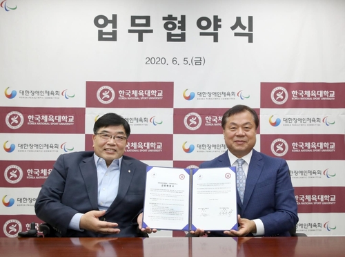 장애인체육회, 한국체대와 체육 인재 양성 MOU 체결 (서울=연합뉴스) 김경윤 기자 = 대한장애인체육회(회장 이명호)는 5일 경기도 이천훈련원 교육동에서 한국체대(총장 안용규)와 체육 인재 양성을 위한 상호협력 방안 등에 관한 업무협약(MOU)을 체결했다. 장애인체육회는 "이번 …
