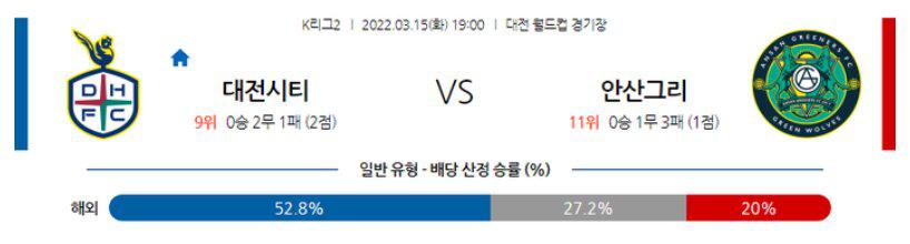저득점 경기가 예상된다. 대전이 아직 전체적으로 팀이 완성된 느낌이 아니고, 안산도 수비적인 기조로 팀을 운영하고 있다. 직전 경기에서 공격적으로 실마리를 잡은 대전이 승부에서는 우세라고 본다. 대전 승 / 언더(2.5)를 추천할 수 있다.