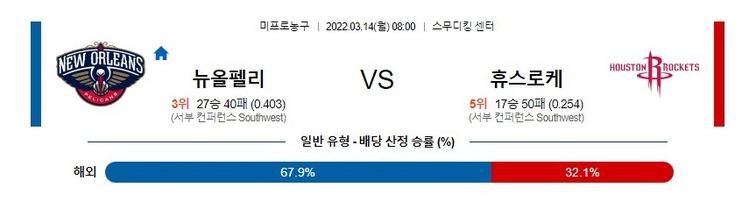 [NBA] 3월 14일 뉴올리언스 vs 휴스턴뉴올리언즈는 직전경기(3/12) 홈에서 샬럿 상대로 120-142 패배를 기록했으며 연속경기 일정이였던 이전경기(3/10) 홈에서 올랜도 상대로 102-108 패배를 기록했다. 4연패 흐름 속에 시즌 27승39패 성적. 샬럿 상대로는 에이스 자원이 되는 브랜든 잉그램이 햄스트링 부상으로 연속 결장하는 가운데 CJ 맥컬럼이 추가적으로 코로나 격리로 이탈한 공백이 크게 나타난 경기. 로테이션 수비가 원활하게 돌아가지 않았던 탓에 연속 득점을 허락했고 세컨 유닛 싸움에서 밀리며 런을 허용하면서 무려 142 실점을 허용한 상황. 또한, 볼 핸들러들의 부담을 덜어줄수 있는 포워드와 빅맨들의 움직임에도 아쉬움이 있었던 패배의 내용.