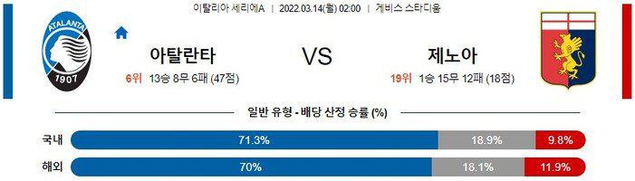 【세리에A】 3월 14일 아탈란타 vs 제노아