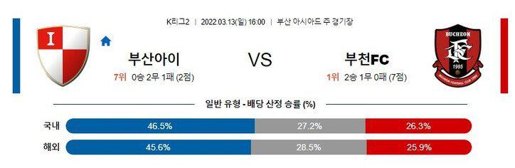 부산의 승리를 예상하고 싶다. 지난 시즌 득점왕이 리그에서 복귀를 앞두고 있고, 지난 경기를 보면 득점 감각에도 문제가 없는 모습을 보였다. 부천의 수비 실수 빈도가 높아 부산이 공략할 여지도 많다. 부천이 리그 1위를 달리고는 있지만 운이 많이 따른 느낌이 크다. 부산 승리 쪽으로 가닥을 잡으면 좋다.