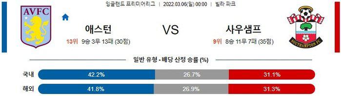 【프리미어리그】 3월 6일 아스톤 빌라 vs 사우스햄튼