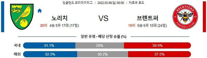 【프리미어리그】 3월 6일 노리치 vs 브렌트포드