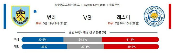 【프리미어리그】 3월 02일 번리 vs 레스터 시티