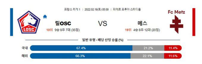 [리그앙] 2월 19일 FC 릴 vs 메스직전 시즌 우승팀이지만 현재 성적은 만족스럽지 못하다. 다만 메스를 상대로 6경기동안 패배하지 않고 있는데다 홈 이점까지 안고 있어 승점 3점에 가까운 것은 확실하다.