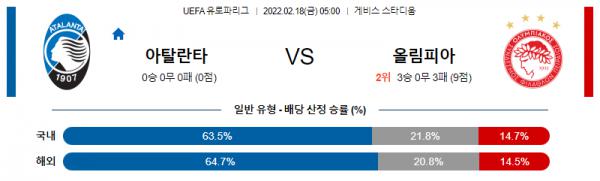 【UEFA유로파】 2월18일 아탈란타 BC vs 올림피아코스 FC● 아탈란타 (리그 5위 / 무무패패무)