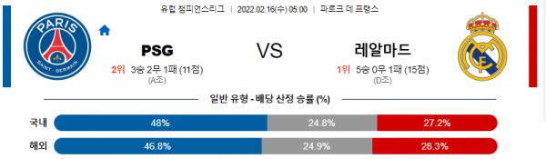 【유럽챔피언스리그】 2월16일 파리 생제르맹(PSG) vs 레알 마드리드