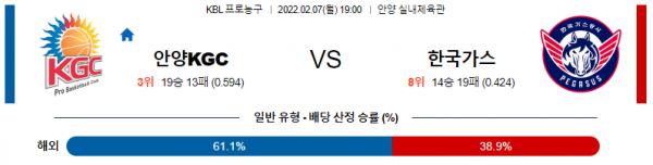 한국가스공사는 직전경기(2/5) 홈에서 원주 DB 상대로 96-90 승리를 기록했으며 이전경기(2/3) 홈에서 창원 LG 상대로 86-80 승리를 기록했다. 2연승 흐름 속에 시즌 18승21패 성적. 원주 DB 상대로는 이대헌(17득점)이 2경기 결장후 복귀했고 앤드류 니콜슨(28득점, 11리바운드)이 '득점기계'의 부활을 선언한 경기. 목 밑으로 담이 심하게 온 두경민이 결장했지만 김낙현(19득점, 11어시스트)이 백코트 싸움에서 차바위가 수비와 리바운드에서 높은 에너지 레벨을 선보인 상황. 또한, 전현우(14득점)의 지원 사격이 팀에 활력소가 되어준 승리의 내용.
