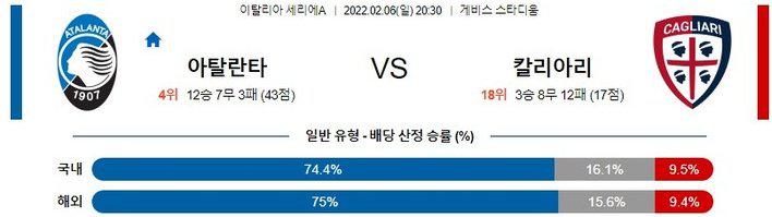 【세리에A】 2월 6일 아탈란타 BC vs 칼리아리