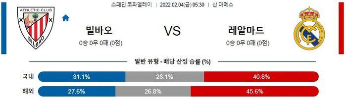 홈팀 아틀레틱 빌바오의 근소한 우세를 예상. 부상 및 코로나, A매치 차출 여파로 인해 공격진의 차포를 떼고 국왕컵 8강전을 치를 위기에 놓인 레알이다. 요근래 준우승만 3번 차지한 빌바오가 국왕컵 우승에 강한 동기부여를 받고 있다는 점, 3주 전 수페르코파 결승전 패배에 대한 설욕의지 역시 남다르다는 점 등을 종합하면 이변 가능성이 낮지 않다고 본다.
