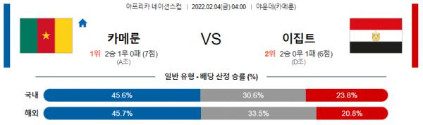 카메룬의 우위를 예상한다. 체력, 홈 어드밴티지, 전술적 우위 모두 카메룬이 앞서고 있다. 카메룬이 16강과 8강에서 보여줬던 전술을 그대로 들고 나올 것이 높다. 이집트가 공격 작업이 원활하다면 모르겠으나, 이집트의 공격 작업은 완성도가 그렇게 높지 않다. 이집트가 스스로 말릴 가능성도 높은 편. 다만 카메룬도 대량득점을 무리하게 노리지는 않을 것이다. 스코어는 언더(2.5)가 유력하다. 카메룬 승 / 언더를 주력으로 삼으면 좋다.
