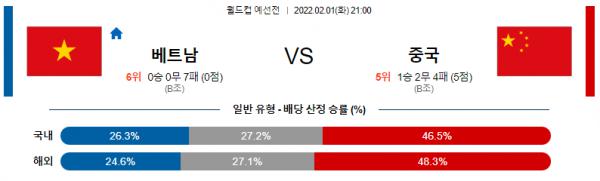 중국이 지면 탈락 확정이니 만큼 귀화 선수들의 출전도 예상 가능하다. 일대일 경합과 피지컬적 약점이 뚜렷한 베트남이 대응에 서투른 모습을 보일 가능성이 높다. 센터백의 신장이 176cm라는 데서 약점이 다 드러나는 셈. 중국 선수들의 결정력도 매우 좋지 않음이 드러나기는 했지만, 멀티골 실점 까지는 가능성을 열어두는 것이 좋다.