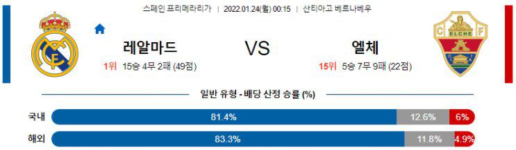 레알 마드리드가 승리하여 홈 무패 기록을 연장할 것이다. 그러나 연장 혈투 때문에 경기력을 제대로 보여주지는 못할 것이다. 벤제마가 돌아오기는 하지만, 지속적인 오른쪽 측면 공격 문제와, 비니시우스가 이전 경기에서 118분이나 뛰었음을 감안하면 벤제마가 돌아온다고 하더라도 3골 이상 대량 득점은 힘들다. 레알 마드리드 승 / 언더 ▼(2.5) / 레알 마드리드 핸디(-1.0) 승이 유력하다.