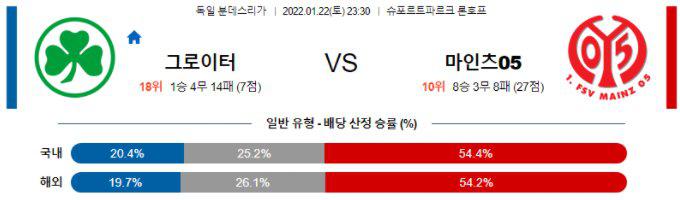 리그 중위권이지만, 유럽 대항전 순위를 충분히 노려볼 수 있다. 다만 그러기 위해서는 홈 / 원정 갭과 최근 승-패를 반복하며 연승을 쌓지 못하는 것을 고쳐야 한다. 다행히 원정에서 압도적 꼴찌 그로이터퓌르트를 만나, 원정 ‘포비아’는 극복할 수 있을 전망.다득점은 기대하면 안된다. 특히 원정이라면 더더욱 그렇다. 원정에서 마인츠는 9경기에서 8골을 득점하는 데 그쳤다. 슈투트가르트와 빌레펠트, 각각 16위와 17위 팀을 상대로도 2경기 2득점으로 좋지 않았다. 그로이터퓌르트의 실점 기록이 처참하기는 하나, 마인츠의 공격력도 거기서 거기다. 2득점 아래로 득점할 가능성이 높다.실점 가능성은 적다. 마인츠의 수비력을 높게 평가하는 것이 아니라, 그로이터퓌르트의 공격력을 보면 그렇다. 그로이터퓌르트는 홈에서 15위 이하 하위권을 상대로 3경기 1득점에 그치고 있다. 비록 마인츠가 강등권 팀을 상대로 원정에서는 2경기 3실점으로 좋지 않지만, 이를 신뢰해도 실점이 많지 않을 것이라는 건 짐작할 수 있다. 1실점 아래, 무실점 경기도 가능하다.