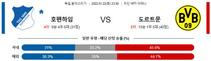 상파울리에게 져서 포칼에서 떨어졌다(1-2 패). 홈에 비해 원정에서의 기복이 매우 심한 시즌을 보내고 있다. 그래도 아직 1위와의 승점 차는 6점. 이미 떨어진 포칼은 잊고, 리그에서 좋은 모습을 보이는 것이 더 도움이 될 것이다. 호펜하임이 상위권이라 상대하기 까다롭기는 하지만, 도르트문트가 우세로 보이는 것은 사실이다.득점력은 좋다. 양 풀백의 전진과 훔멜스(CB)를 중심으로 하는 후방 빌드업으로 공격에서의 수적 우위를 가져오려는 성향이다. 최근 5경기에서도 14득점을 기록하며 물오른 득점력을 자랑하고 있다. 역시 주역은 홀란드(FW / 최근 5경기 5골 1도움)다. 압도적인 팀 득점 1위로, 2위 브란트(AM / 최근 5경기 1골 4도움)와 비교하면 3배가 차이날 정도로 득점 지분이 많다. 원정에서 5위 팀 이상을 상대로 2경기 4골을 넣은 만큼 이번 경기에서도 멀티골 득점은 가능할 것이다.수비는 불안하다. 극단적인 공격을 추구하는 팀은 아니지만, 그래도 풀백의 전진성과 후방 빌드업을 중시하는 터라 뒷공간 문제점은 항상 노출하는 상태다. 팀 빌드업의 중추인 훔멜스(CB)의 스피드가 좋은 편이 아니라 커버가 늦는 경우가 많다. 최근 5경기에서 무실점 경기가 한 경기 뿐으로 상대도 꼴찌 그로이터퓌르트를 홈에서 만난 경기였다(3-0 승). 즉 상위권인 호펜하임전에서는 실점 가능성이 높다고 볼 수 있다. 이번 경기에서도 2실점 까지는 가능성을 열어주자.