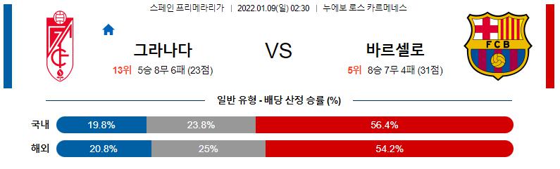 근소 전력 우세를 앞세운 바르셀로나가 상대를 몰아칠 준비를 마쳤다. 하지만 현재 스쿼드를 100% 활용하지 못하는 상황서 제 경기력을 내긴 힘들고, 원정 불리까지 겹쳐 승기를 잡는데 애로가 많다. 오히려 최근 맞대결서 거센 저항을 보여준 그라나다가 다시 선전하며 상대를 깊은 부진에 빠뜨릴 것으로 점쳐진다. 무승부, 언더(2.5점 기준)를 예상하는 쪽이 옳다.