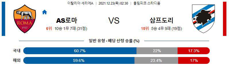 열람중 [세리에A] 12월 23일 AS 로마 vs UC 삼프도리아 메이저 2021.12.22 1435