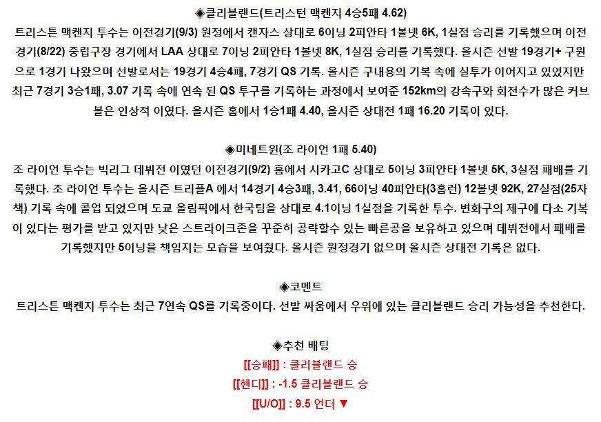 【MLB】 9월9일 클리블랜드 vs 미네소타 야구분석