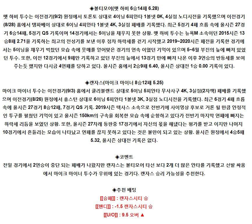 【MLB】 9월9일 볼티모어 vs 캔자스시티 야구분석