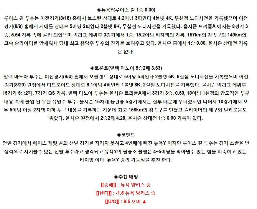 【MLB】 9월9일 뉴욕양키스 vs 토론토 야구분석