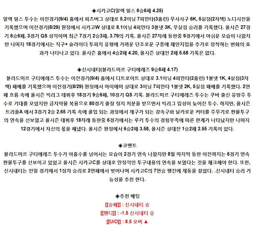 【MLB】 9월9일 시카고컵스 vs 신시내티 야구분석