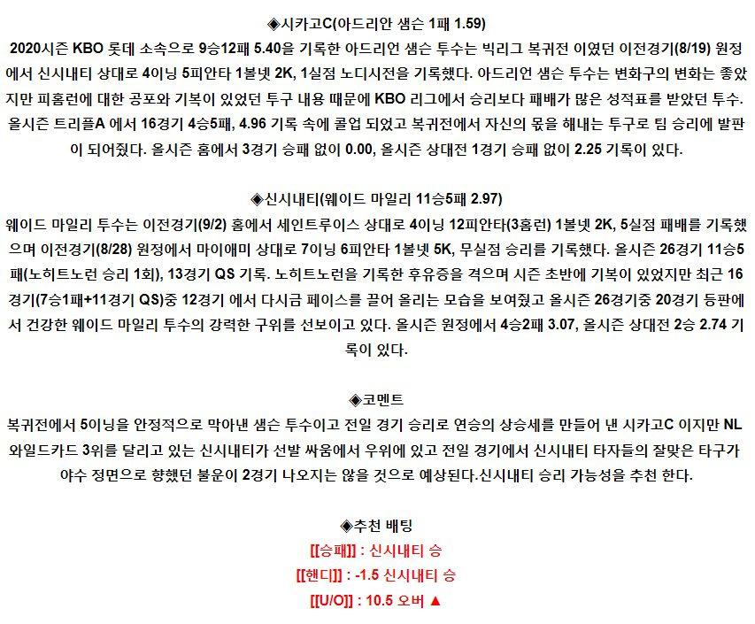 【MLB】 9월8일 시카고컵스 vs 신시내티 야구분석