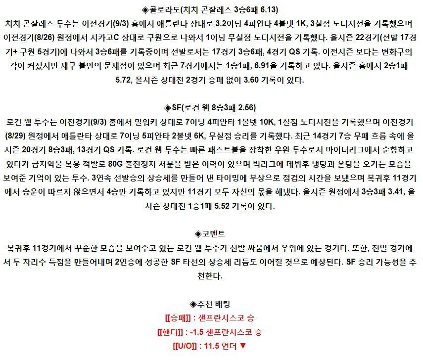 【MLB】 9월8일 콜로라도 vs 샌프란시스코 야구분석