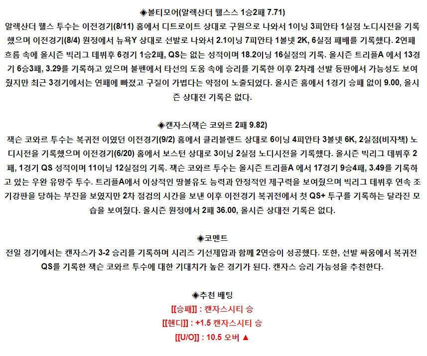【MLB】 9월8일 볼티모어 vs 캔자스시티 야구분석