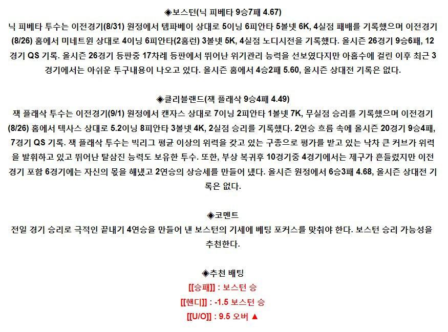 【MLB】 9월6일 보스턴 vs 클리블랜드 야구분석