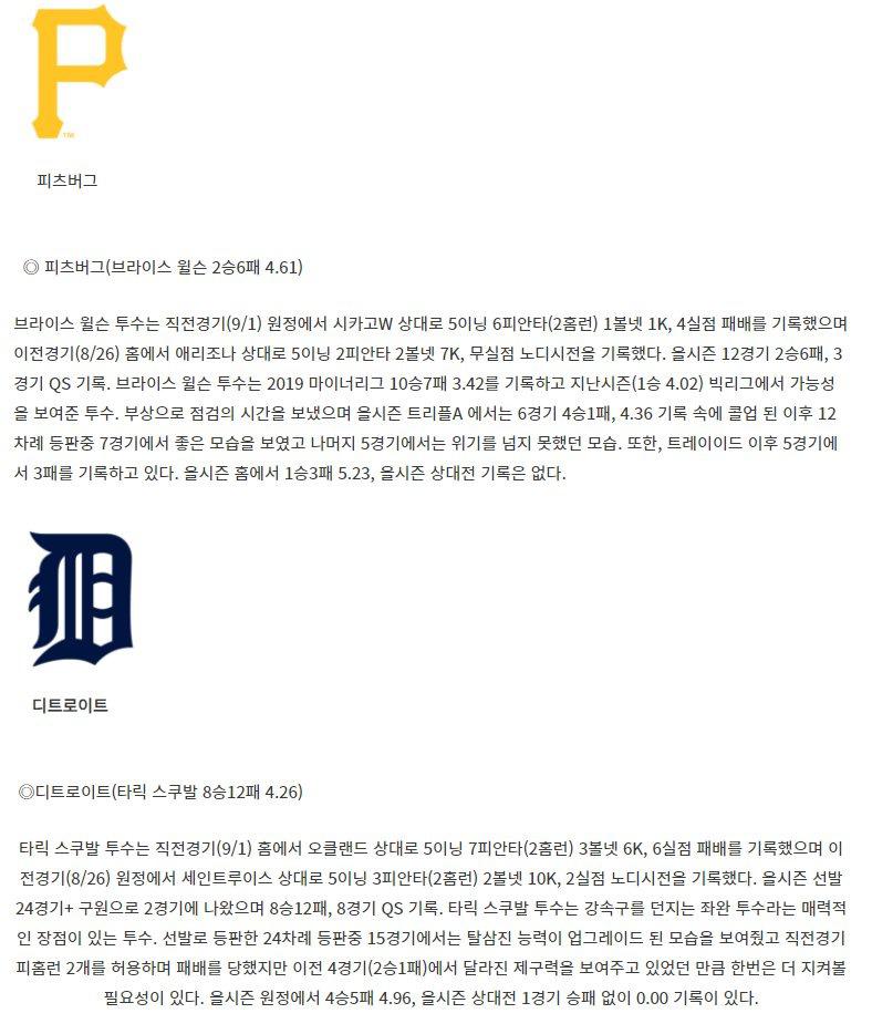 【MLB】 9월7일 피츠버그 vs 디트로이트 야구분석