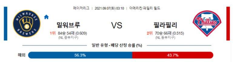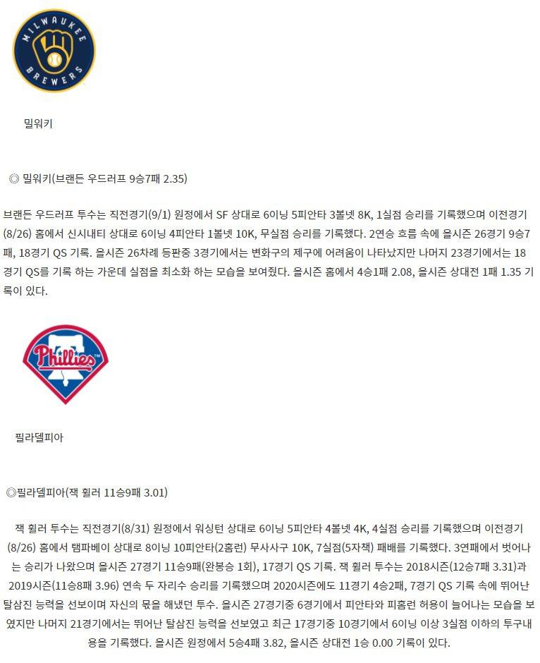 【MLB】 9월7일 밀워키 vs 필라델피아 야구분석