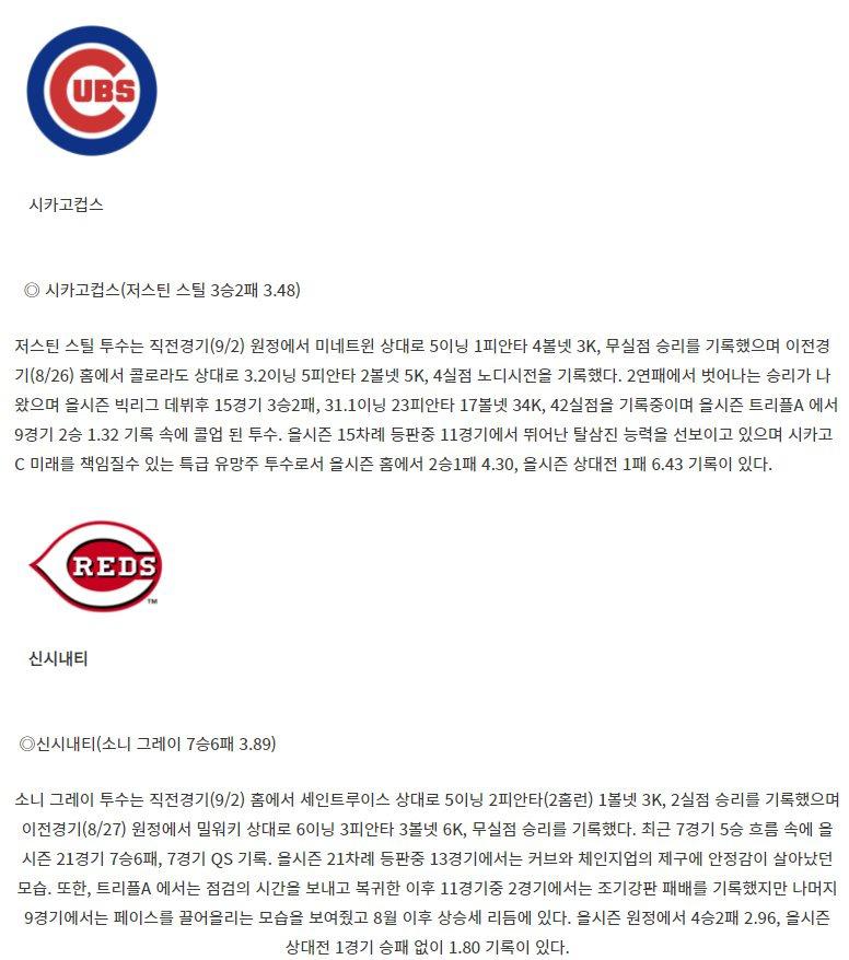 【MLB】 9월7일 시카고컵스 vs 신시내티 야구분석