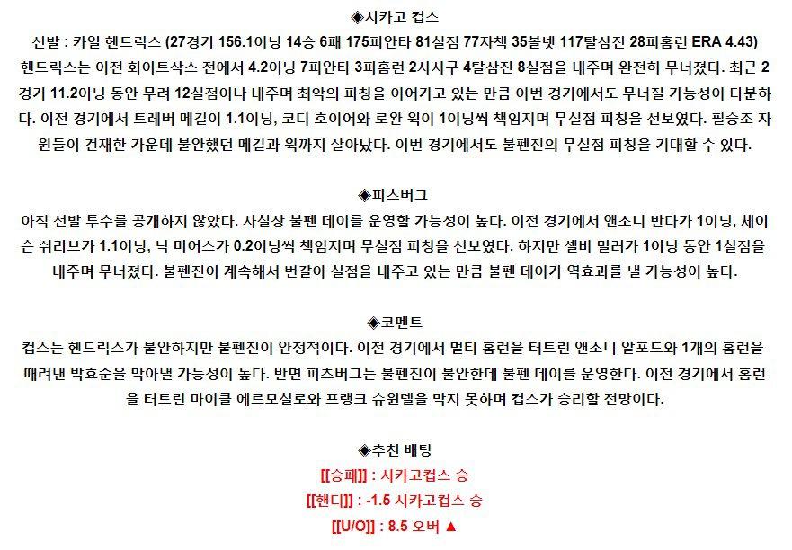 【MLB】 9월5일 시카고컵스 vs 피츠버그 야구분석 야구중계 해외야구중계 해외야구분석 MLB분석 MLB중계