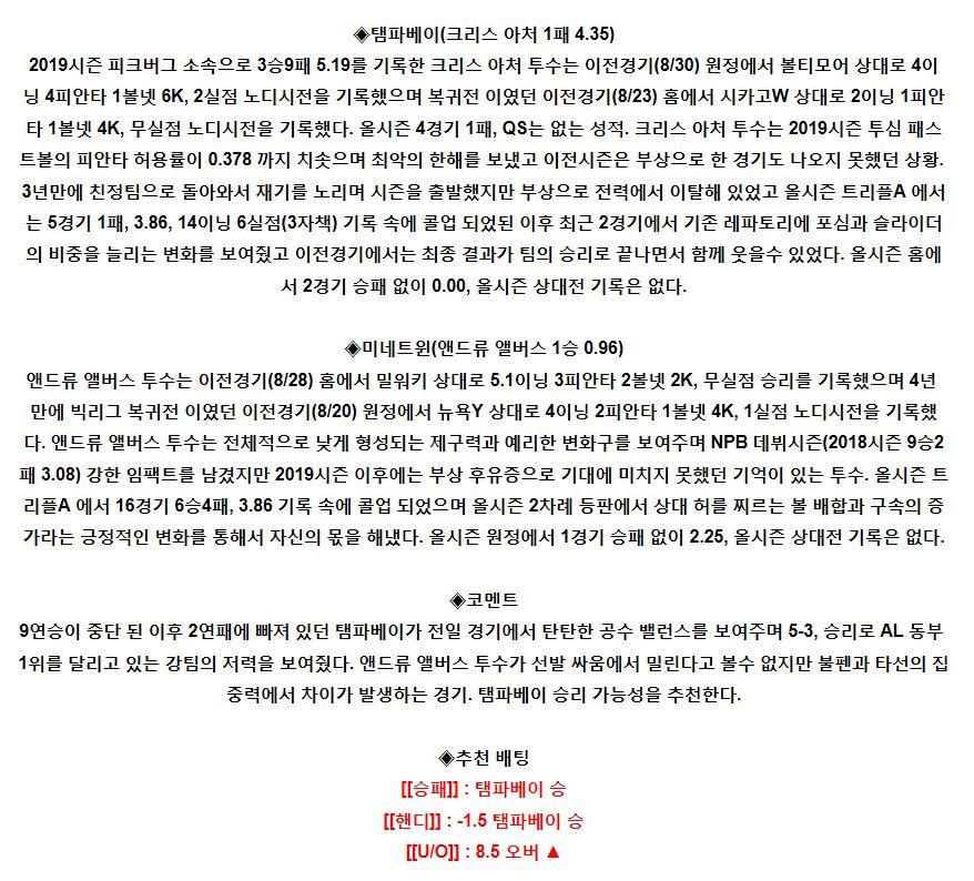 【MLB】 9월5일 템파베이 vs 미네소타 야구분석 야구중계 해외야구중계 해외야구분석 MLB분석 MLB중계