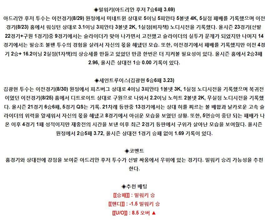 【MLB】 9월5일 밀워키 vs 세인트루이스 야구분석 야구중계 해외야구중계 해외야구분석 MLB분석 MLB중계