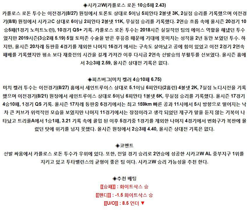 【MLB】 9월2일 시카고화이트삭스 vs 피츠버그 야구분석