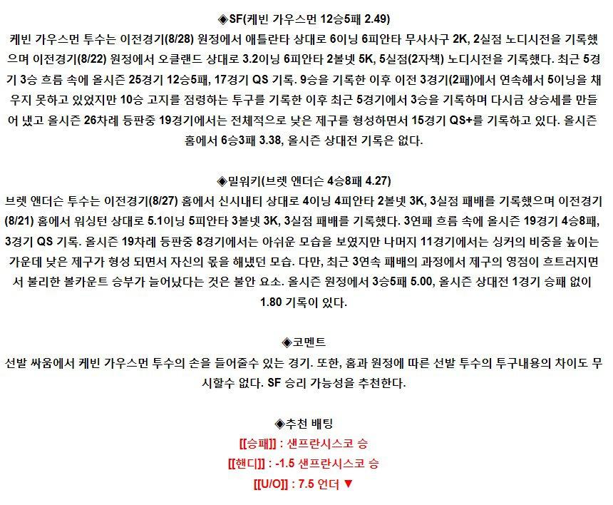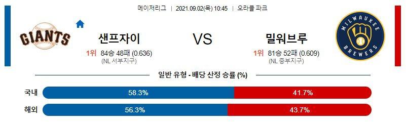【MLB】 9월2일 샌프란시스코 vs 밀워키 야구분석
