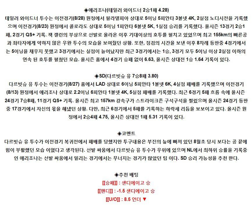 【MLB】 9월2일 애리조나 vs 샌디에이고 야구분석