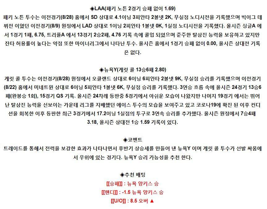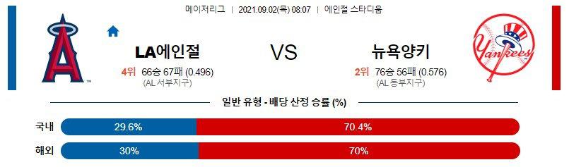 【MLB】 9월2일 LA에인절스 vs 뉴욕양키스 야구분석