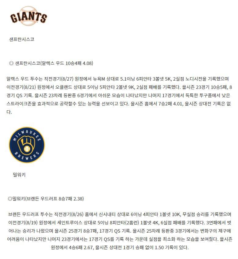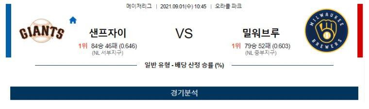 【MLB】 9월1일 샌프란시스코 vs 밀워키 야구분석 야구중계 해외야구중계 해외야구분석 MLB분석 MLB중계