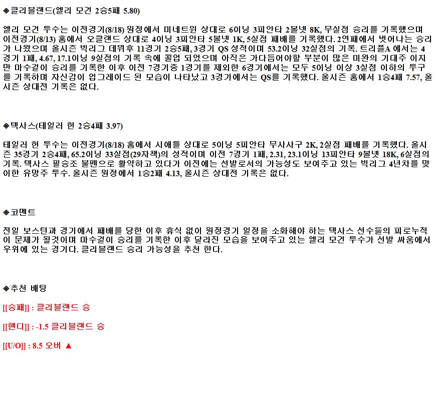 2021년8월25일 클리블랜드 인디언스 텍사스 레인저스 해외야구중계
