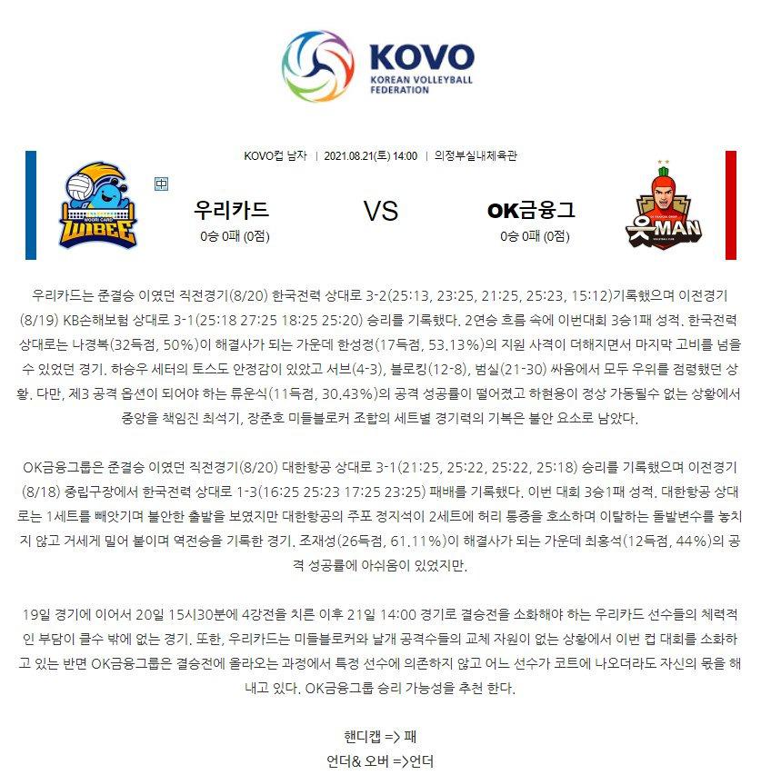 [KOVO컵 남자] 8월21일 우리카드 vs OK금융그룹 국내배구분석 무료중계 스포츠중계 스포츠분석 배구중계 배구분석 코보중계