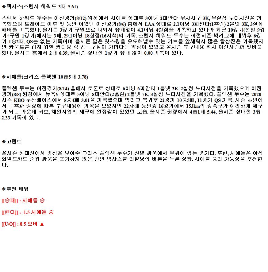 2021년8월20일 텍사스 레인저스 시애틀 매리너스 해외야구중계