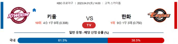 한화는 시범경기 13경기에서 9승1무3패 승률 0.750을 기록했고 4연승으로 마무리하면서 기분 좋게 정규시즌 개막을 맞이하게 되었다. 90억 타자 채은성의 영입으로 시범경기에서 5개 홈런을 기록한 노시환과 함께 타선의 무게감을 업그레이드 시킨 상황. 하지만, 정규시즌 다승 2위, 평균자책점 1위, 탈삼진 1위(244K), 피안타율 1위(0.188), 이닝당 출루허용률 1위(0.95)를 기록한 이후 가을야구에서도 에이스의 모습을 보여준 안우진 투수를 상대로 시범경기에서 나타난 한화 타선의 뜨거움이 이어지기는 힘들 것으로 예상됩니다. 키움 승리 가능성을 추천 합니다.
