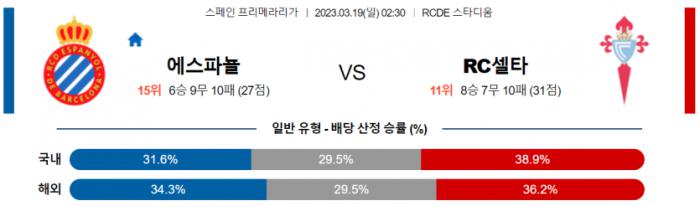 무승부 가능성을 보겠습니다. 에스파뇰이 세트피스에서는 약점을 보이고 있는 상황이지만, 오픈플레이에서의 거친 플레이를 바탕으로 실점을 억제하는 능력 자체는 갖춘 팀. 셀타비고의 세트피스 득점이 올 시즌 적은 편이라, 에스파뇰이 버티는 힘을 보여줄 수 있을 것으로 보입니다. 물론 에스파뇰도 철저하게 롱볼로 운영하면서 공격보다는 수비에 초점을 맞추고 있어, 두 팀이 모두 득점을 기록하기에는 환경이 녹록치는 않습니다.