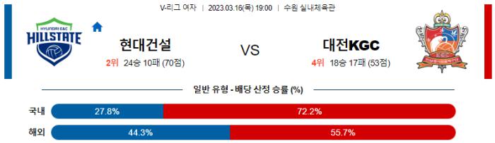 3월 16일 19:00 V-리그 여자 현대건설 : KGC인삼공사